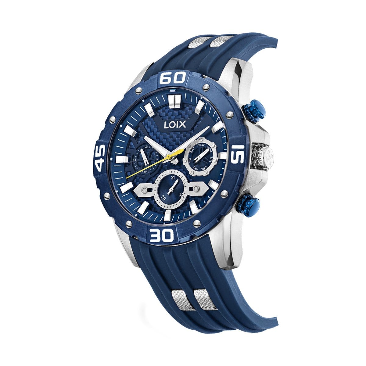 Nuestro Loix LA2145 es un reloj de pulso con una estética marcadamente deportiva y robusta, caracterizado por su intenso color azul y un tablero con textura de fibra de carbono. Este modelo multifunción integra tres subesferas que indican el día de la semana, la fecha y el formato de 24 horas, resaltando visualmente gracias a sus manecillas plateadas y un segundero en color amarillo neón para un contraste dinámico. Su estructura combina una caja de acero inoxidable con un bisel numerado de estilo industrial y una correa de silicona de alta resistencia con detalles metálicos, lo que lo convierte en un accesorio imponente y moderno ideal para un uso casual o deportivo.