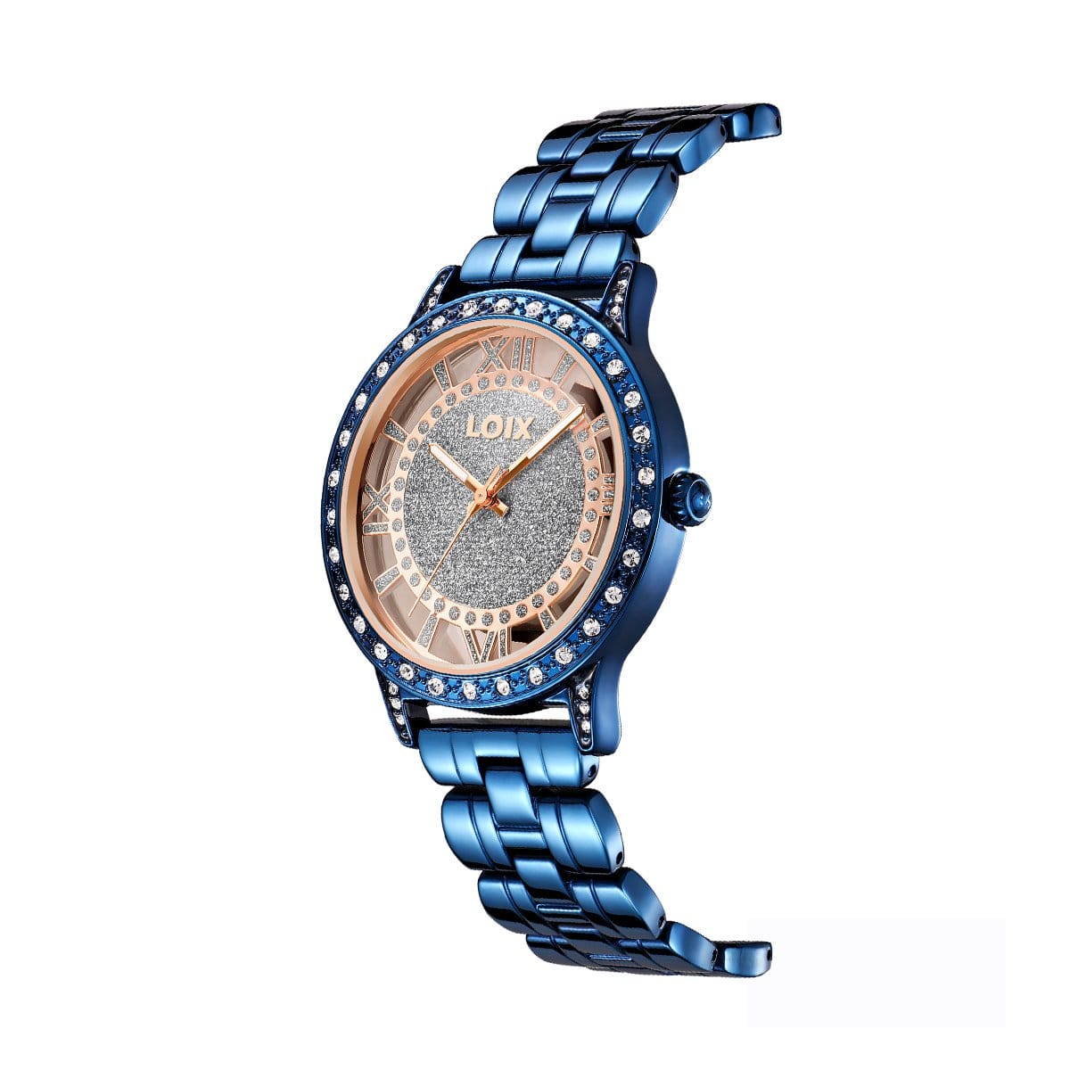 Este reloj LOIX es una pieza de moda atrevida y glamurosa. Su pulsera y esfera en vibrante color turquesa metalizado contrastan con una caja en oro rosa. El bisel está adornado con cristales brillantes, lo que lo convierte en un accesorio espectacular que inyecta color y lujo a cualquier look.