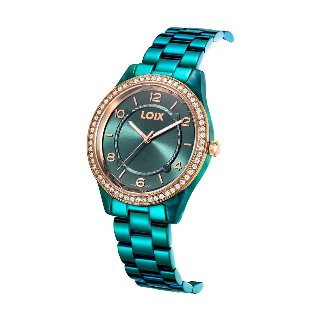 Este reloj LOIX es una pieza de moda atrevida y glamurosa. Su pulsera y esfera en vibrante color turquesa metalizado contrastan con una caja en oro rosa. El bisel está adornado con cristales brillantes, lo que lo convierte en un accesorio espectacular que inyecta color y lujo a cualquier look.